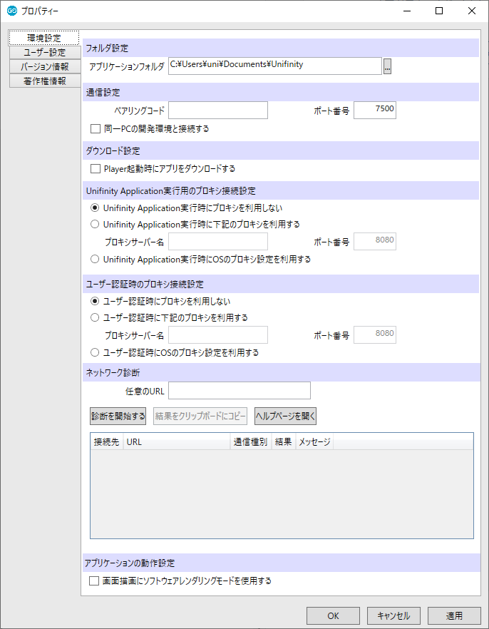 | application folder | Specify a folder where Unifinity Application Player stores application files. Do not delete the folder specified here. Also, do not create a project in Unifinity Studio in this folder. |