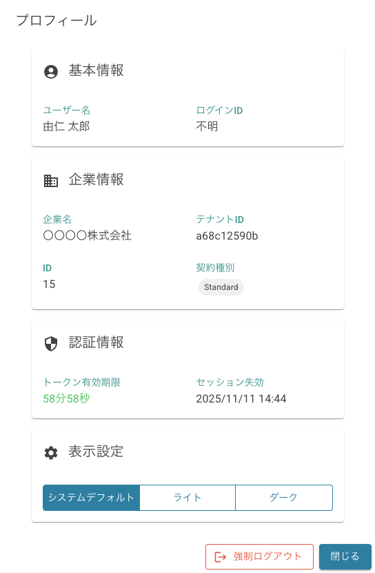 The profile dialog shows Basic Information, Company Information, and Authentication Information. You can also enable Dark Mode in the display settings. These display settings are saved in your browser.