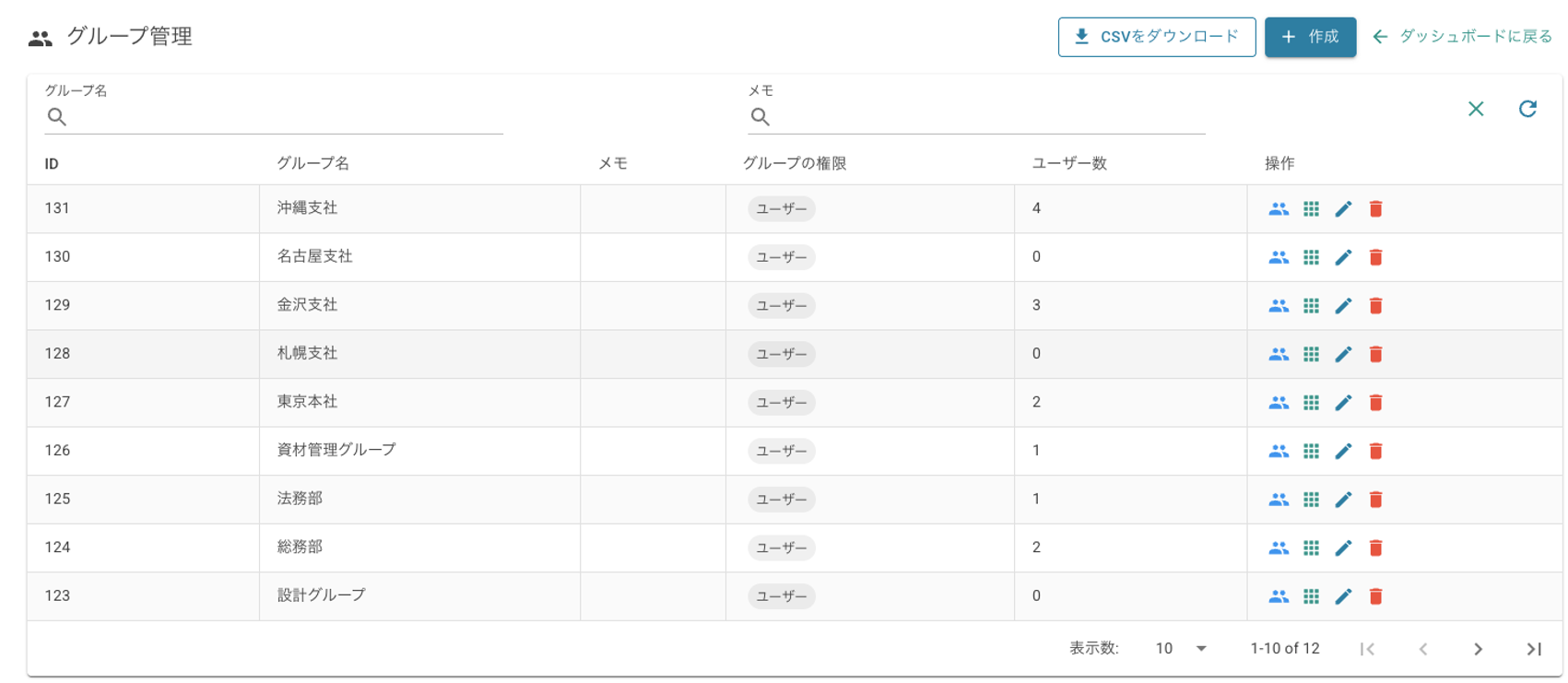 Shows all groups registered in UniBaaS. Columns include Group ID, Group Name, Memo, Group Permissions, Number of Users, and Action Buttons. The default sort order is ascending by registration. You can change the order by hovering over the ID column header and clicking the up/down arrows. To edit group information, click Edit. To delete a group, click Delete. If many groups exist, they will be split across multiple pages. Click the page number icons to switch pages. To change the number of items displayed per page, select the desired number from the dropdown at the bottom right of the list. |