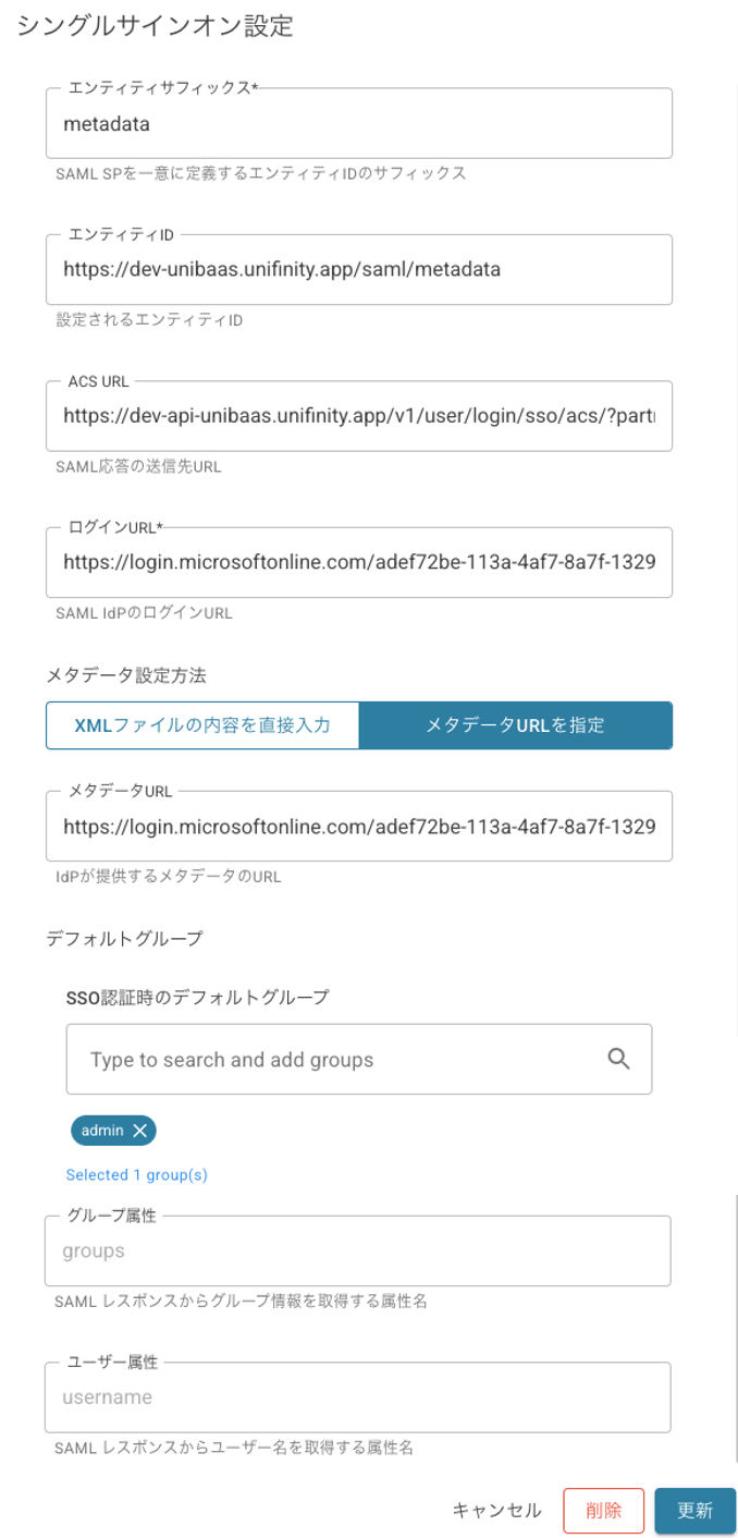 - Specify the name of the group on UniBaaS to be assigned when automatically creating UniBaaS users. This value is used if GroupName is not specified or if the Assertion specified for GroupName could not be obtained.