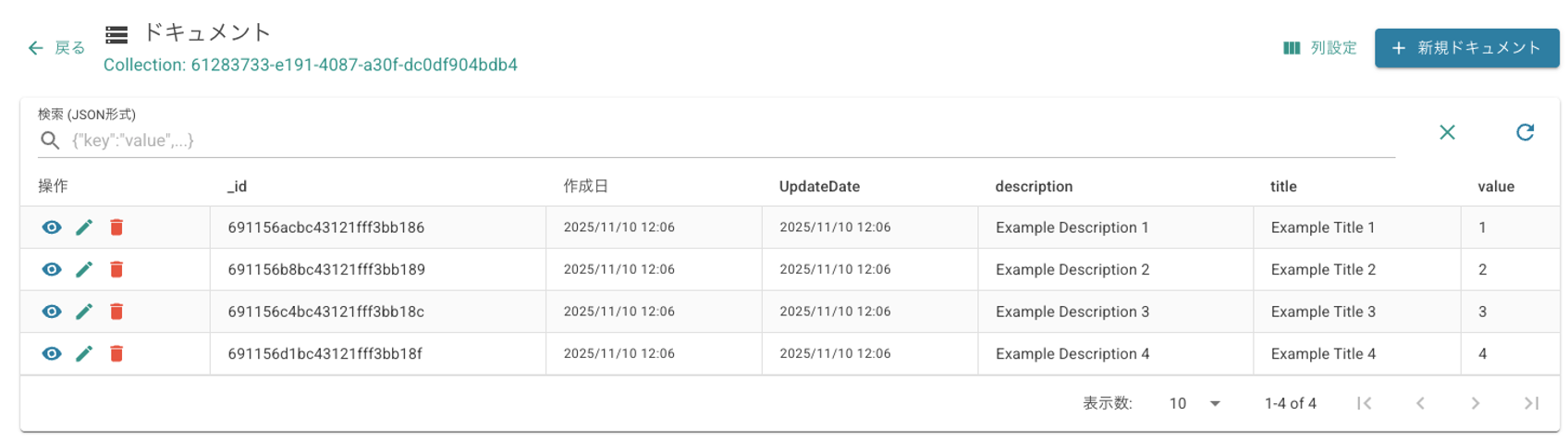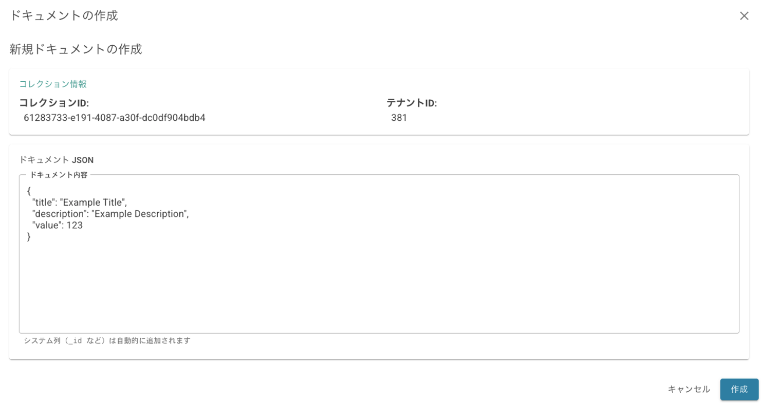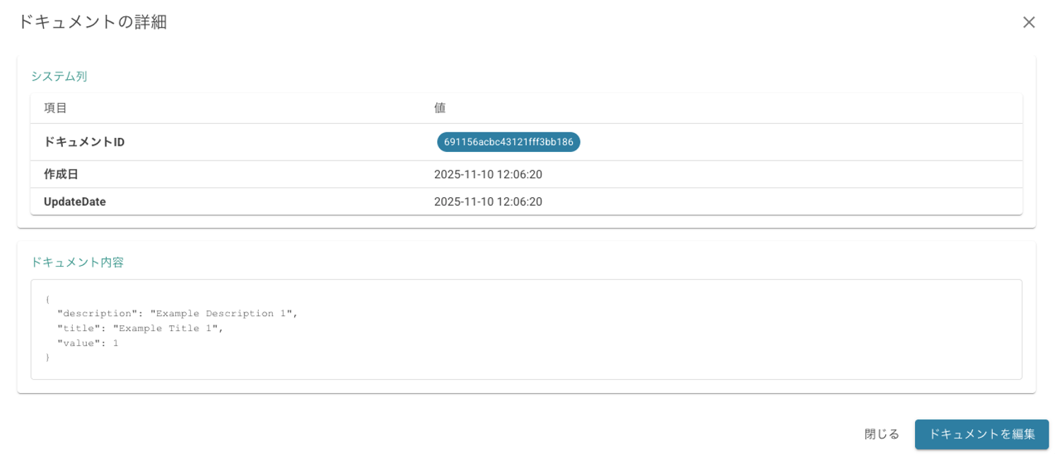 | Document List | Displays the list of documents in the selected collection. Display columns can be customized. Clicking a row opens the document detail dialog. |