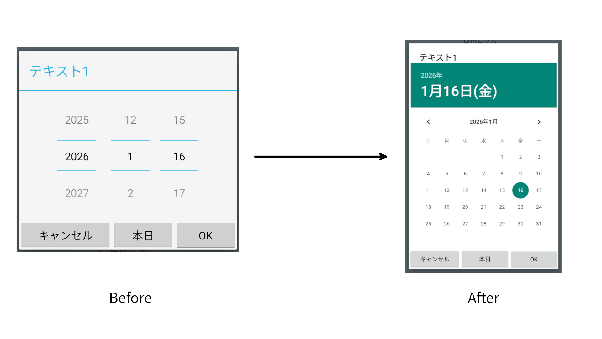 When the input content is set to "Date" or "Date and time" in the "Text" control, or when the input content parameters for "Date" or "Date and time" are specified in the "Dialog/Input" logic, the date input operation has been changed from drum roll format to calendar format.