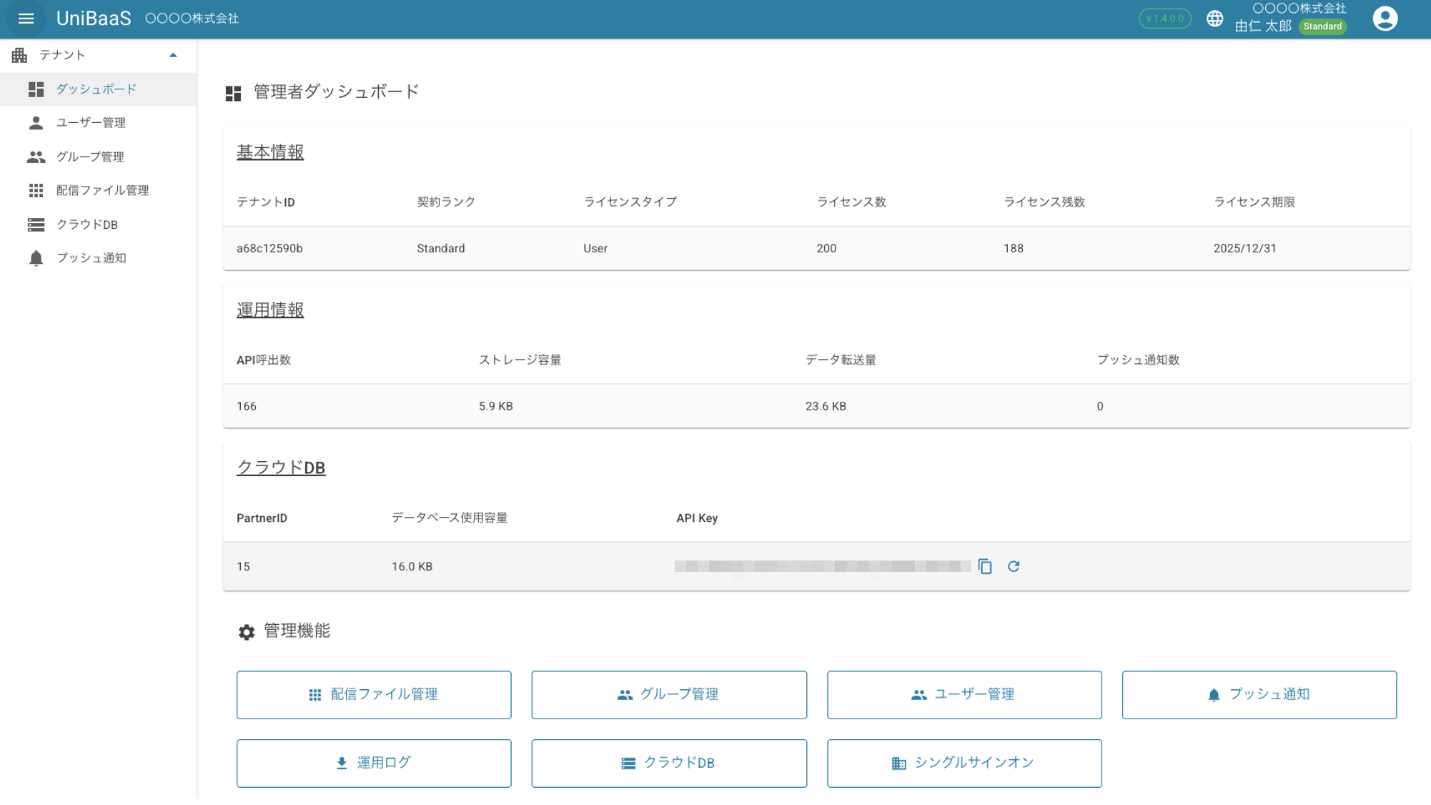 | 運用情報 | API呼出回数、データ転送量などの運用に関する情報が表示されます。 |