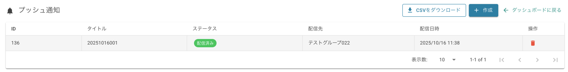 配信済み、または配信予約中のプッシュ通知のリストです。ID、タイトル、ステータス、配信先、配信日時、削除ボタンが表示されます。