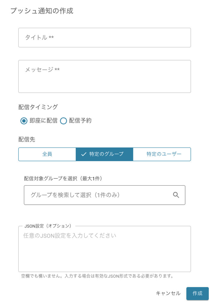 Android/iOSのデバイスに対してのみプッシュ通知の配信ができます。[+作成]ボタンをクリックするとダイアログが表示されます。
