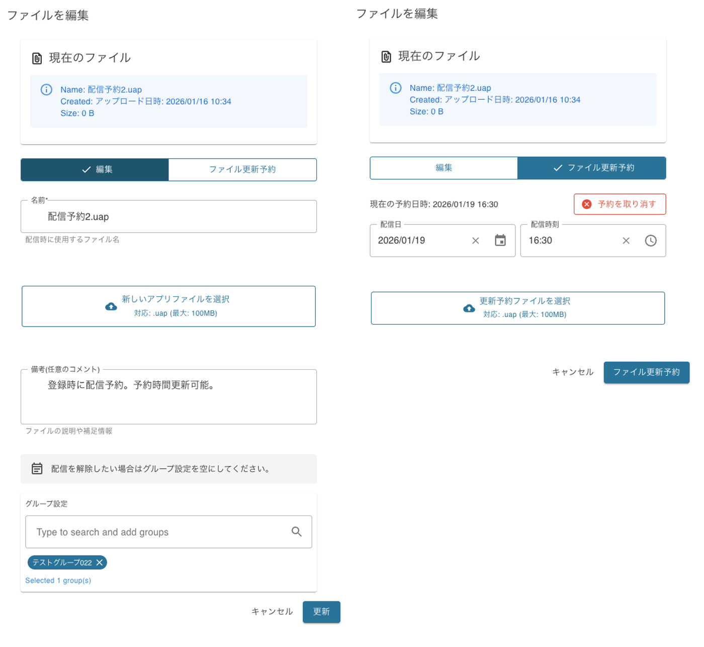 - 配信ファイルの更新予約機能において、予約時間の変更のみを行なえるよう修正しました