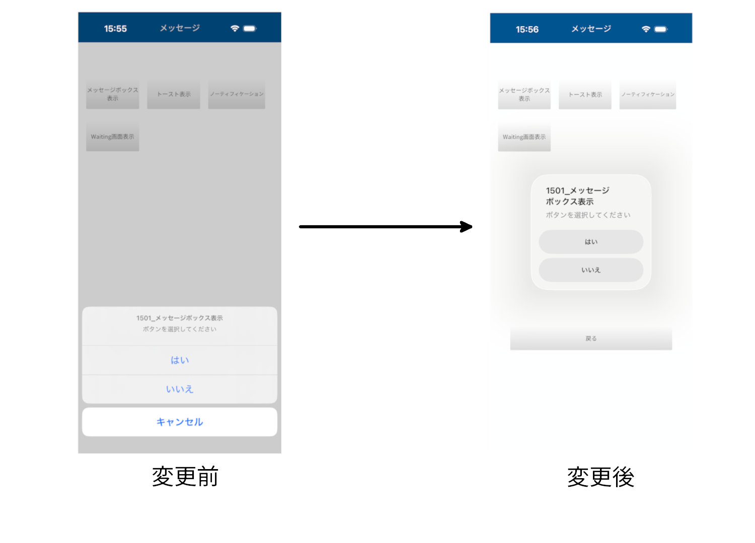 表示されなくなったボタンについては、ダイアログ外の領域をタップすることで同等の動作となります。