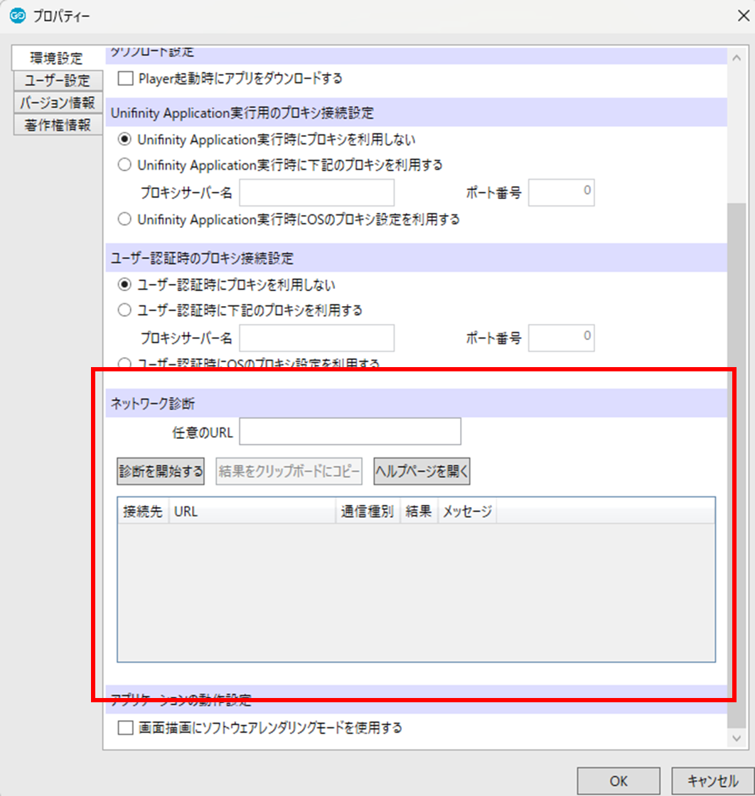 ようこそ画面、Unifinity Studio、Unifinity Playerそれぞれの設定メニュー内に「ネットワーク診断」の機能を追加しました。Unifinityの認証サーバーやUniBaaS DB、社内サーバーなどへ、通信が疎通可能かの確認をワンタッチで行うことができます。詳細は「9. ネットワーク診断機能について」をご覧ください。