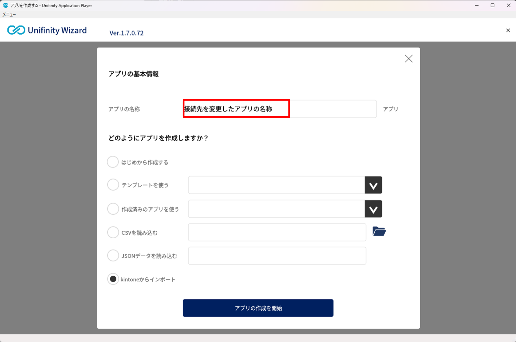 Unifinity Wizardから、「kintoneアプリ2」に接続するアプリをご作成ください。