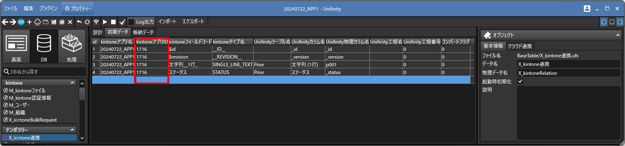 テーブル「X_kintone連携」には、Unifinitとkintone間でデータ連携を行うための情報が記録されています。