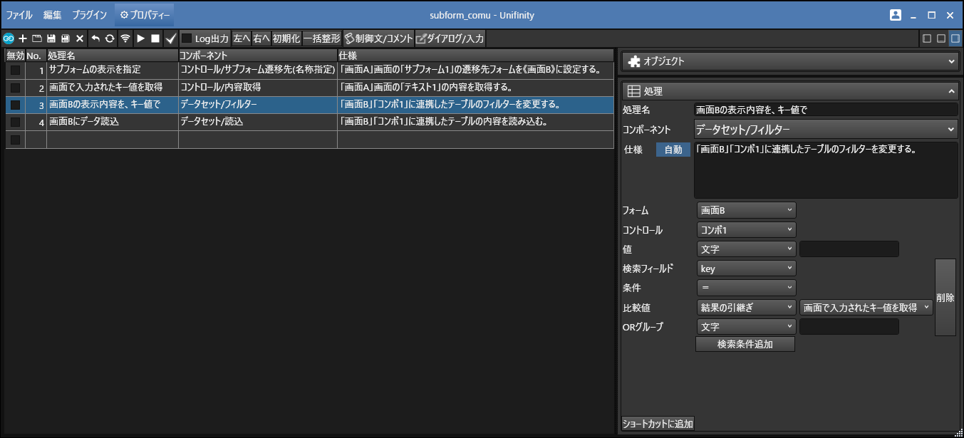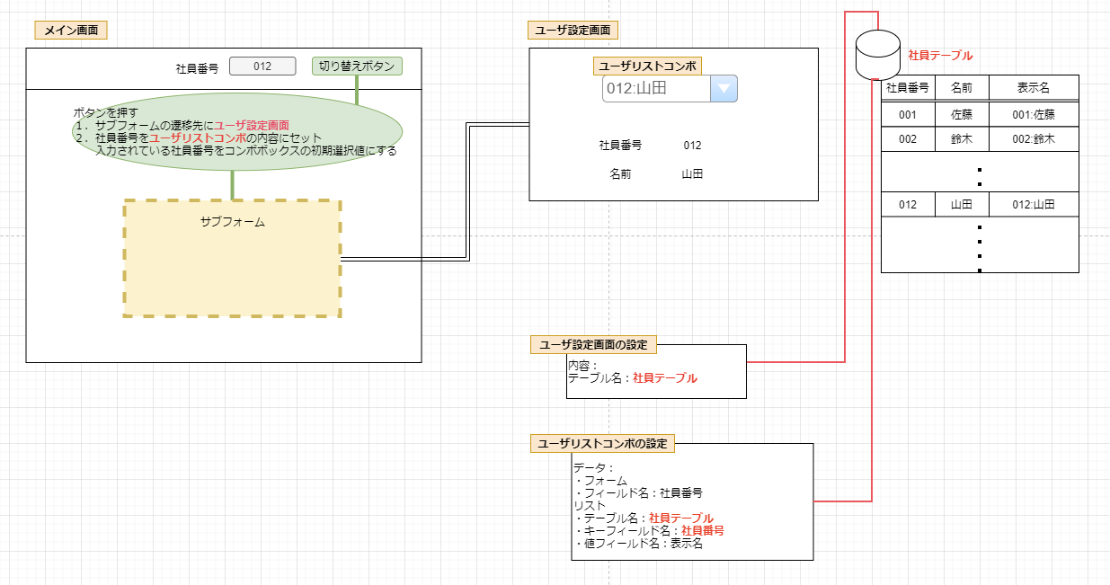 ・画面Aのサブフォームに画面Bを設定し、入力されたキー値と関連するデータを画面に表示する。