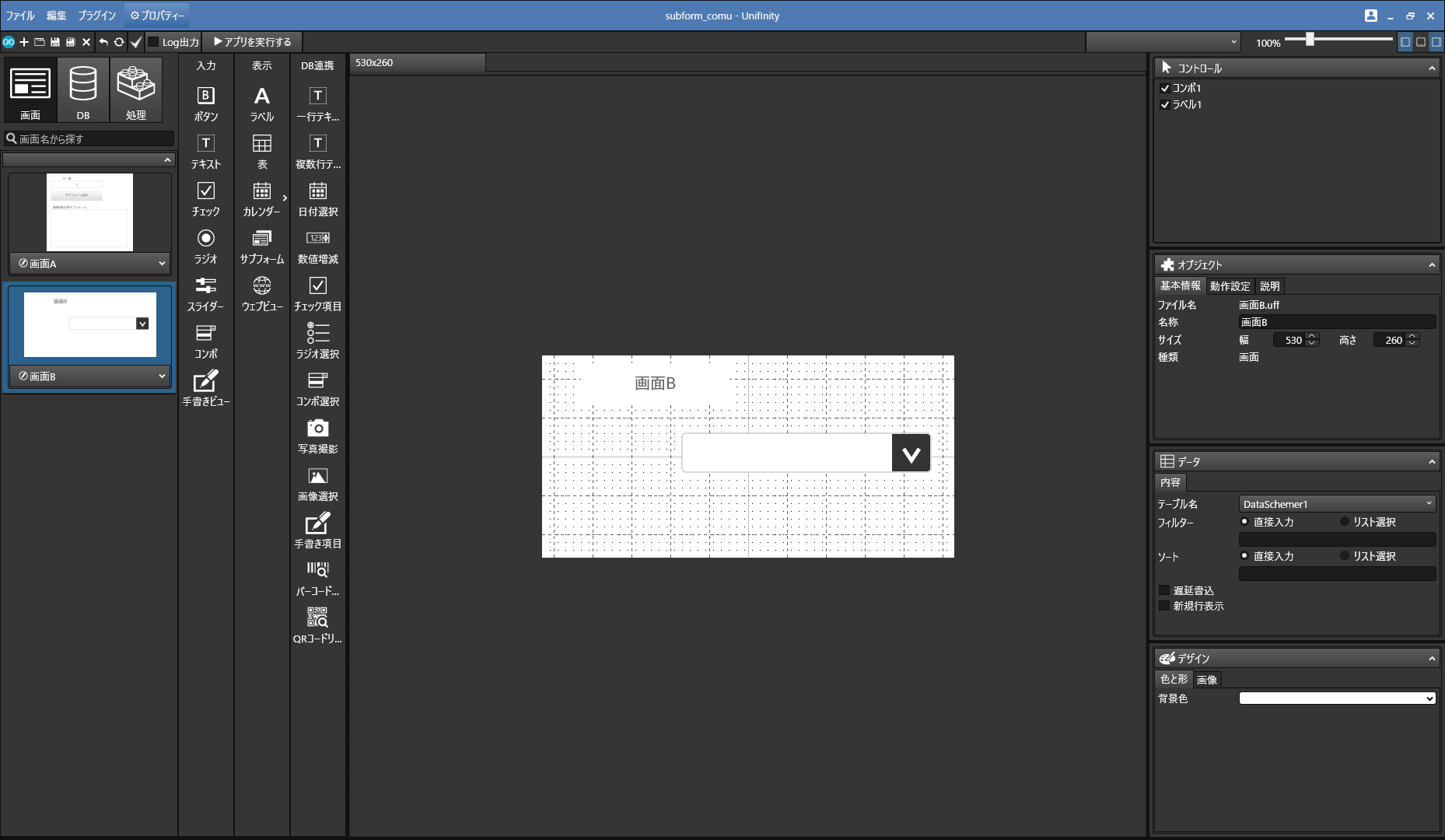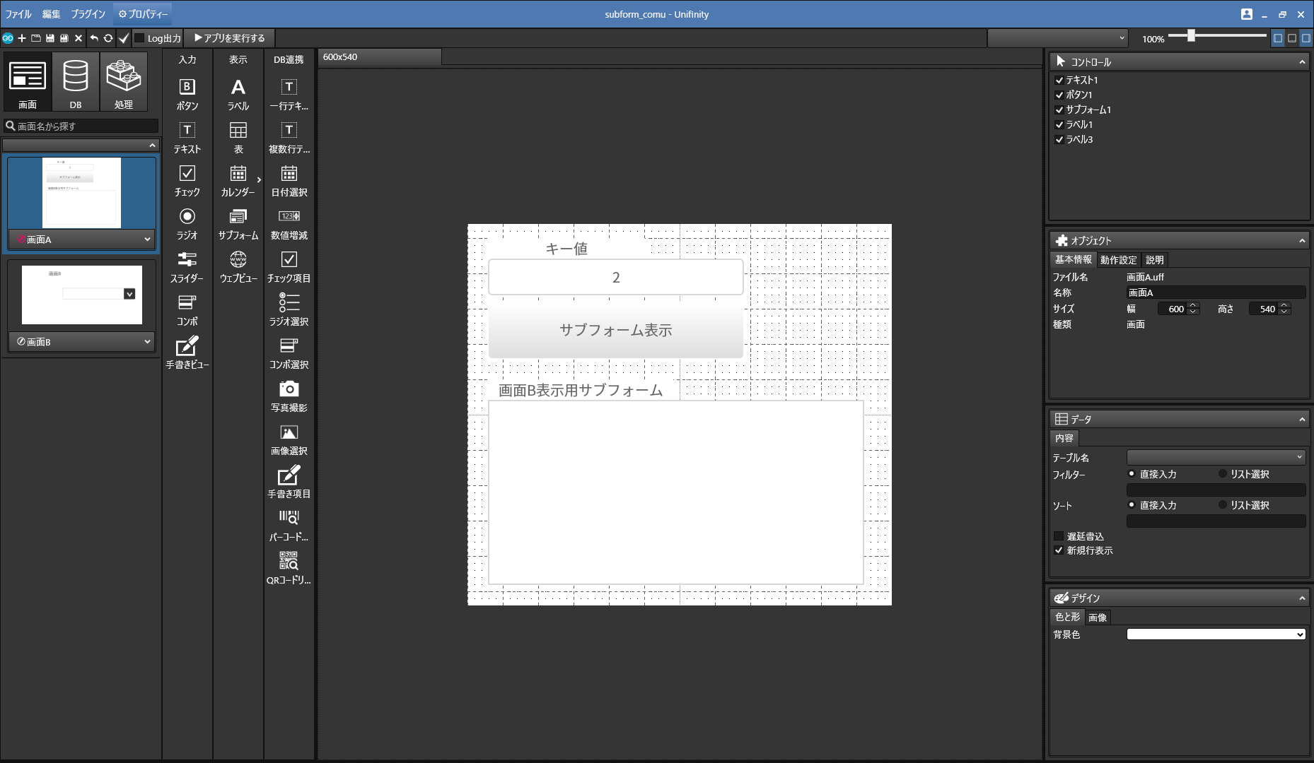画面B(サブフォームに表示させるための画面)