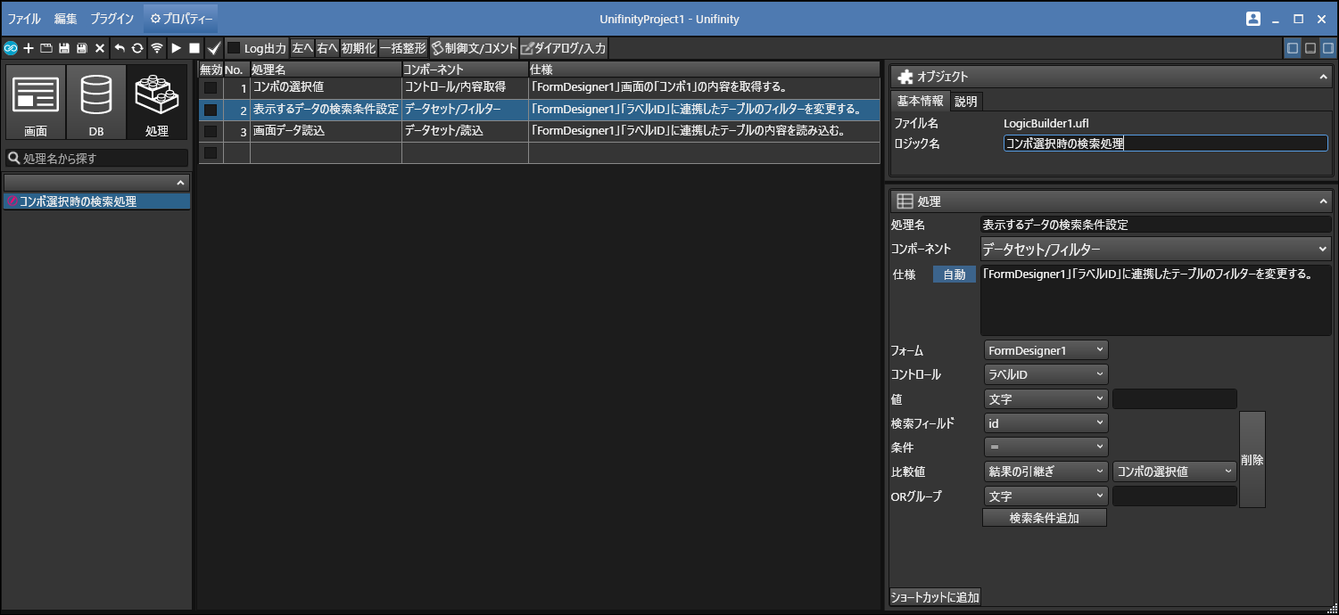 ・ユーザ設定画面で表示するデータを検索する処理を作成し、「ユーザーリストコンボ」の「オブジェクト>動作設定>実行処理」に設定する。