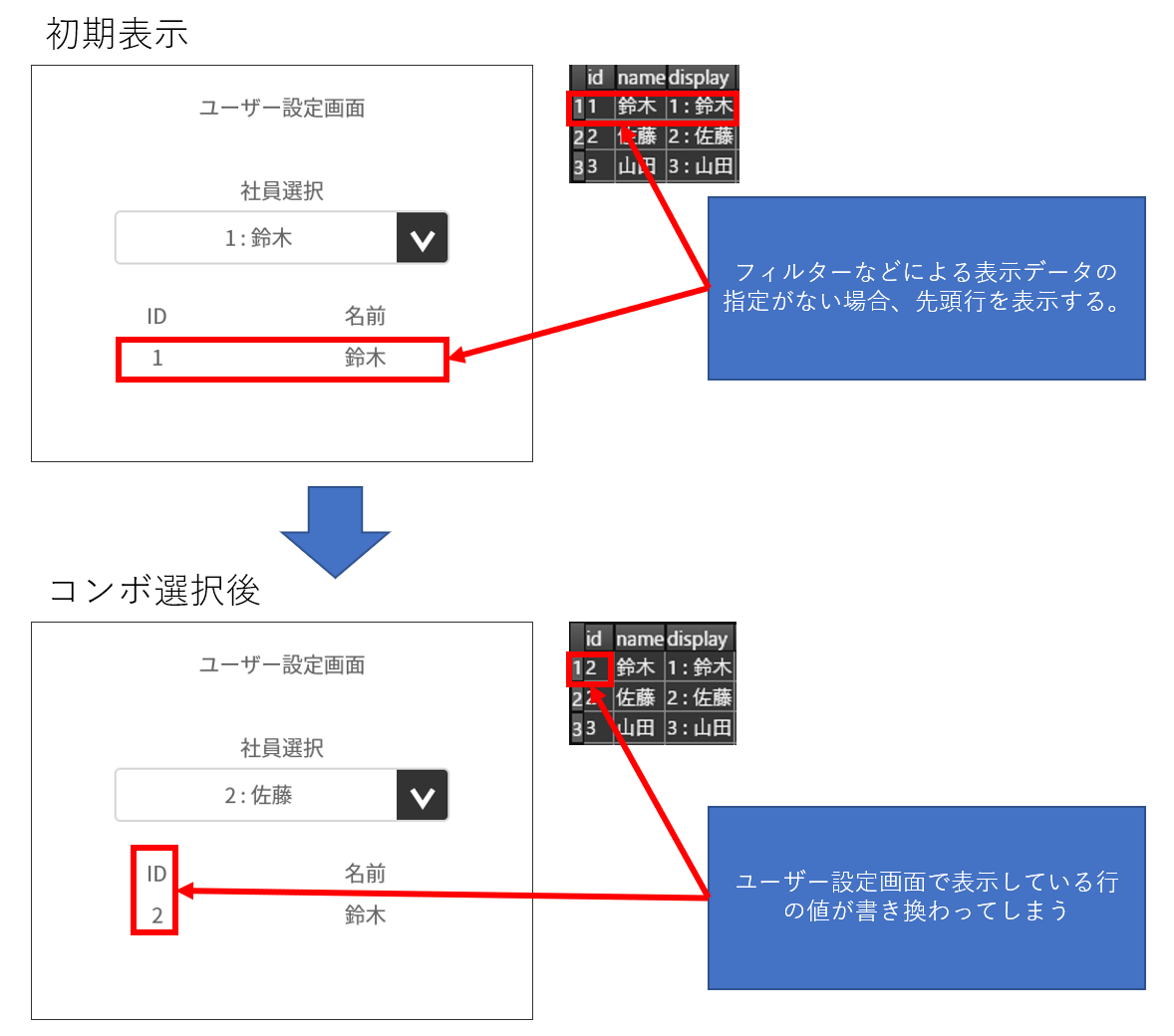 「ユーザーリストコンボ」の「データ>内容」の設定は不要かと存じます。「ユーザーリストコンボ」の「データ>内容」に値が設定されている場合、以下画像のようにユーザ設定画面で表示している行の値が書き換えられてしまいます。