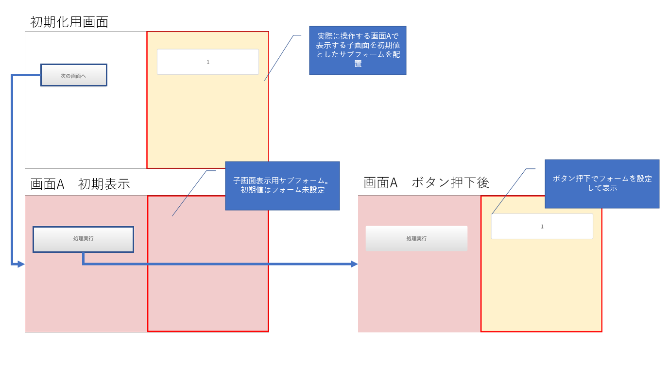 →「●初回のボタン押下」の際に画面Bの実体化が完了しているため、セットした値が画面Bに反映される。サブフォームの遷移先に利用する画面の初期化というのはいつやることが正しい実装なのでしょうか。