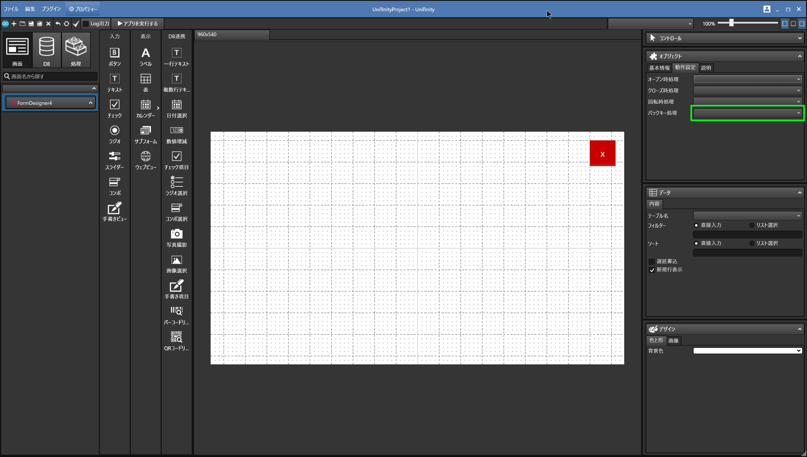バックキー処理は、コントロールを何も選択していない状態で、以下の箇所にて設定することができます。